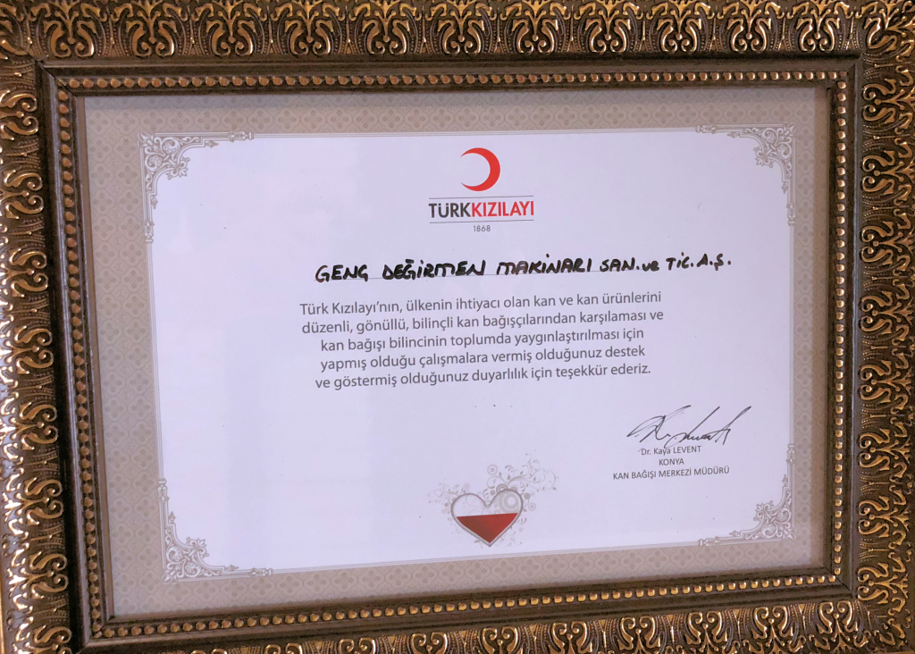 Türk Kızılayı'nın, ülkenin ihtiyacı olan kan ve kan ürünlerini düzenli, gönüllü, bilinçli kan bağışçılarından karşılaması ve kan bağışı bilincinin toplumda yaygınlaştırılması için yapmış olduğu çalışmalara verdiğimiz destek ve duyarlılık için Türk Kızılayı tarafından şirketimize teşekkür belgesi verilmiştir.